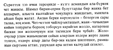 Kyrgyz (also spelled Kirghiz) are a Turkic ethnic group found primarily in Kyrgyzstan. Kirgiz is spoken principally in the Kirgiz republic of the Soviet Union, which borders China and whose capital is Frunze. Like Turkmen, Uzbek, and Kazakh, it is one of the Turkic languages, and is spoken by about l million people. Kirgiz was written in the Arabic script until 1928 when the Latin alphabet was introduced, which in turn was replaced by the Cyrillic in 1940. *** Kirgiz (Kirghiz) is spoken/used in Kyrgyzstan Language Family